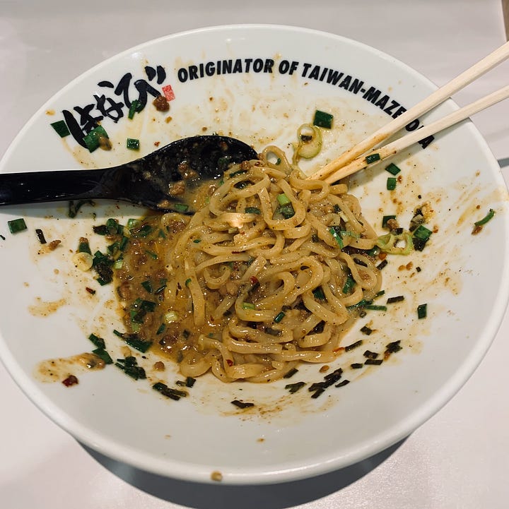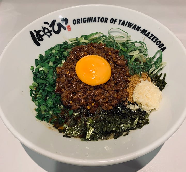 Then, in 2008, a ramen shop called Menya Hanabi tried to build on that Taiwan ramen tradition. The owner was experimenting with the seasoned minced meat — the signature of the style — but couldn’t get the broth right. As the story goes, he was about to throw the meat away when a part-time worker in the shop suggested simply putting it on boiled noodles with no soup at all. He tried it. He kept it. That accidental decision became Taiwan mazesoba — brothless ramen — and it spread from that one shop in Nagoya to the rest of Japan.