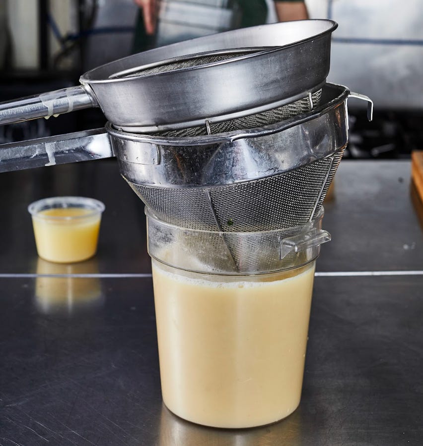 Paitan — creamy white chicken stock. Boiled hard to emulsify collagen.